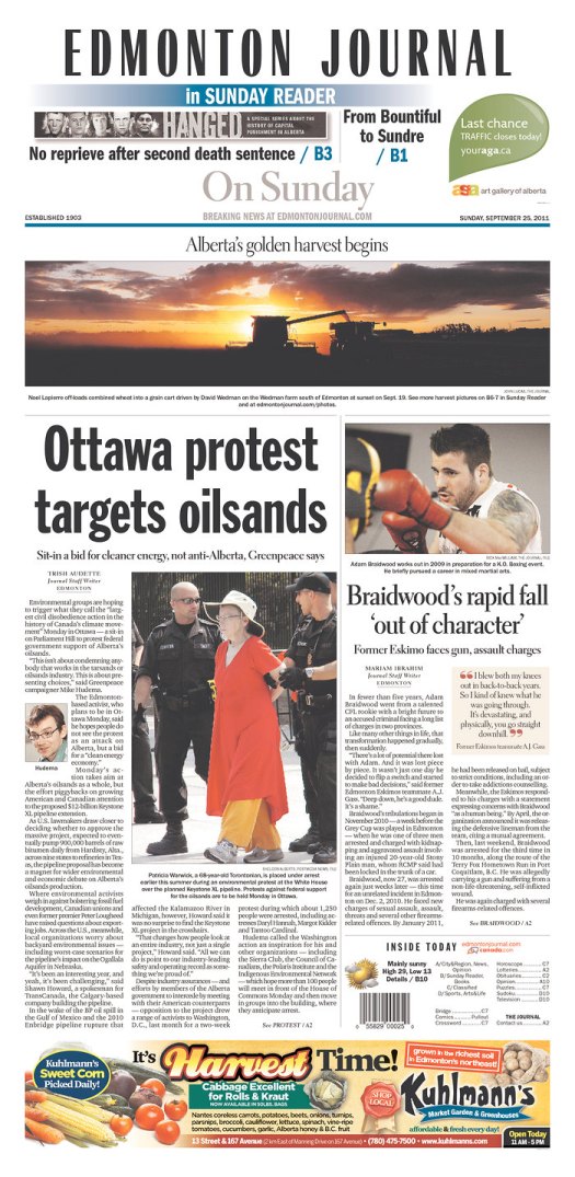 As seen in The Edmonton Journal: “Environmental groups are hoping to trigger what they call the ‘largest civil disobedience action in the history of Canada’s climate movement’ Monday in Ottawa — a sit-in on Parliament Hill to protest federal government support of Alberta’s oilsands.